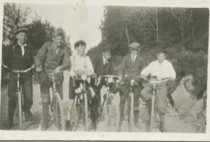 Sex män är ute på cykeltur från Kållered till Hyssna år 1930. Från vänster: 1. Karl Nilsson (född 1918), Tulebo. 2. Okänd. 3. Okänd. 4 Okänd. 5. Okänd. 6. Eivind Kullbring (1918-1996).