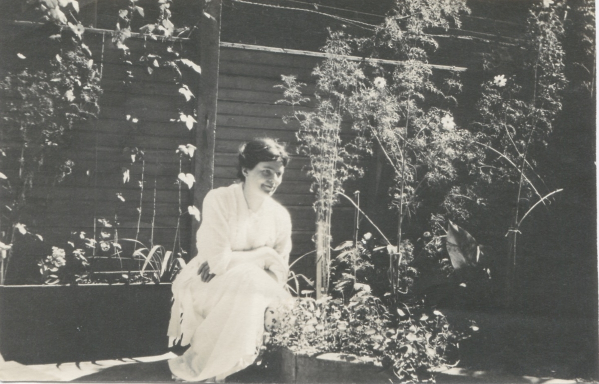 Alma Nelsson (född Eriksson) sitter i en trädgård i USA 1920. Född 1881 på Ekan i Kållered, död 1959 i USA. Gift med Carl Nelson.