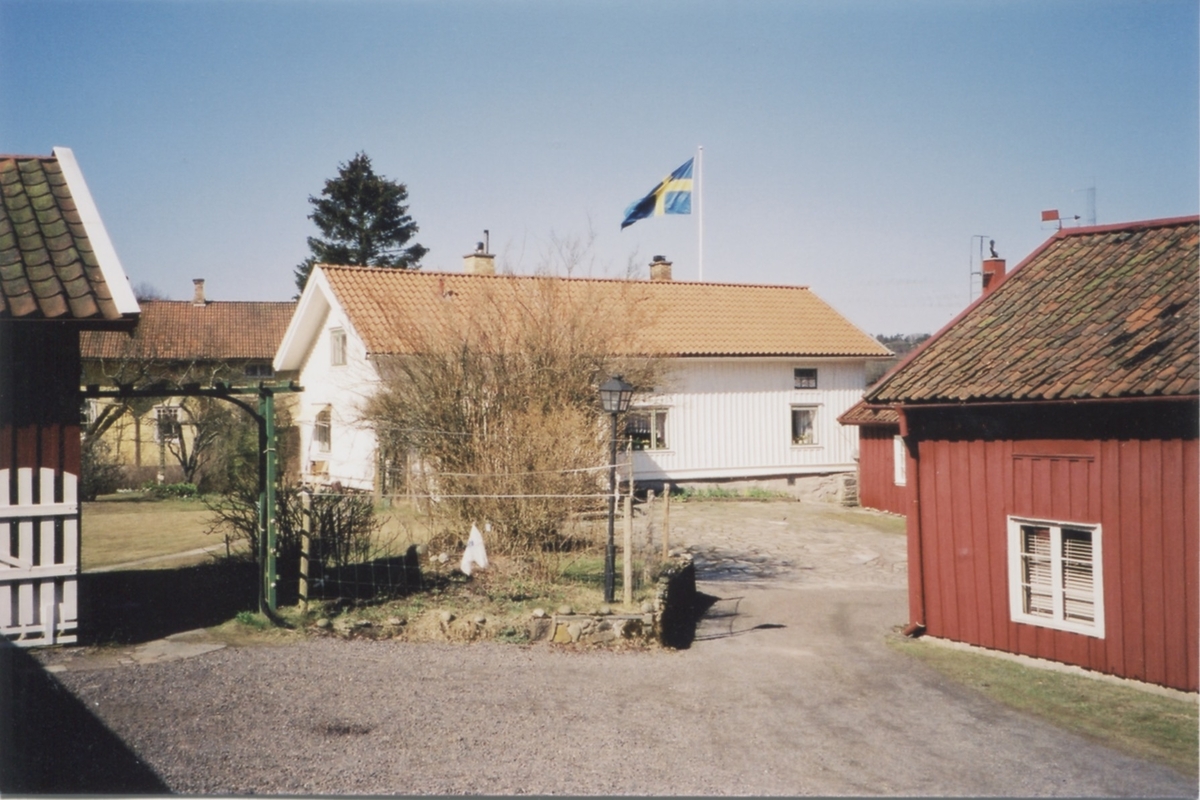 Erikssons Heljered Mellangård 1:2 "Store Börjes" 1980-tal. I bakgrunden till vänster skymtas det gula huset Heljered Västergård 3:3 "Larses". Svenska flaggan är hissad.