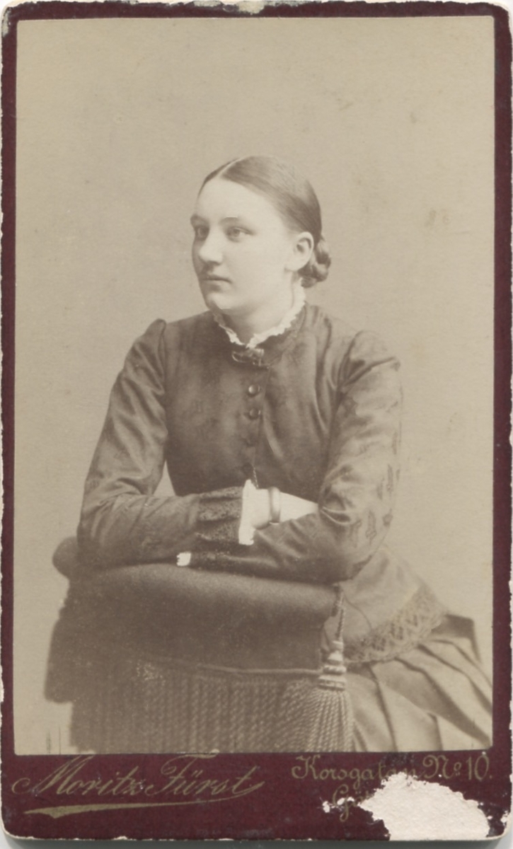 Ateljéporträtt av Mathilda Bengtsson (1866 - 1945) från Stora Kullbäckstorp i Råda. Var småskollärarinna i Kållered 1883-1898 och bodde i skolhuset. Hon hade skäktingar på Bölet i Kållered.