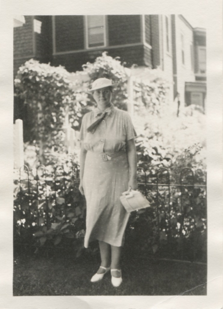Alma Nelsson (född Eriksson) står utanför ett bostadshus i USA 1938. Född 1881 på Ekan i Kållered, död 1959 i USA. Växte upp i Vommedal Östergård "Olas". Emigrerade med systern Klara till USA år 1905. Gifte sig med Carl Nelson och de fick sonen Robert 1907/1908. Alma var dotter till predikanten Karl Eriksson, Vommedal Östergård "Olas" och Alida född på Hallen i Kållered. Alma höll tät kontakt med släkten i Kållered.