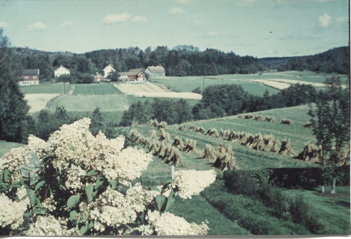 Vy från Hedbäcken mot Kålleredgården-Apelgården okänt årtal. I förgrunden ses syrener. Fotograferat av Sigge Haag, Bölet, som tog foto för att sedan måla av motivet.