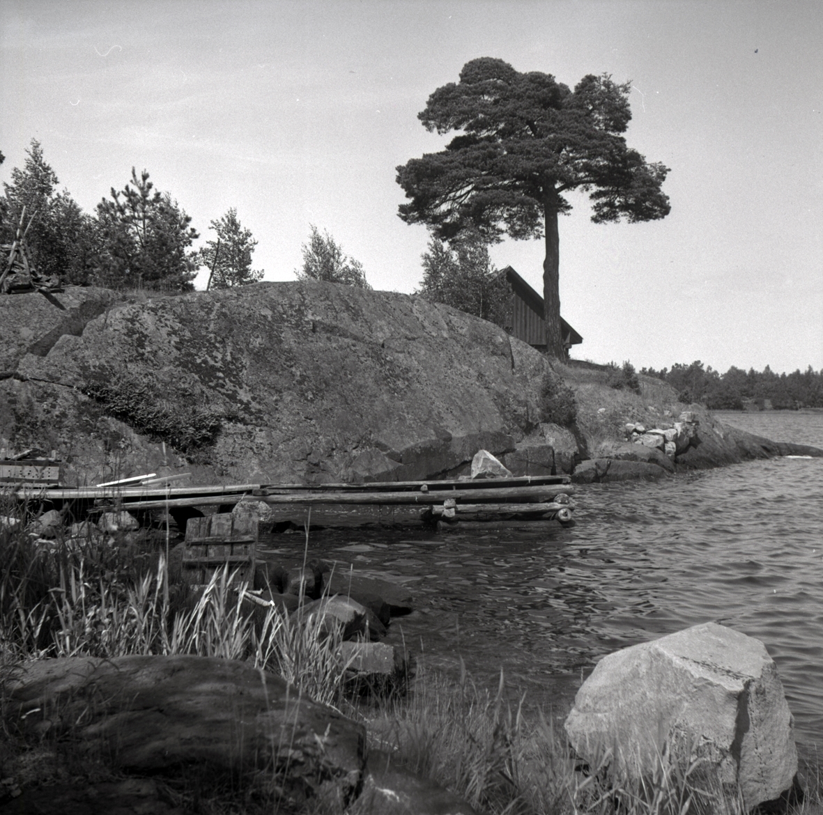 Misterhults socken, Kärrviks hamn, brygga med stenkistor och en klipphäll med sjöbod.