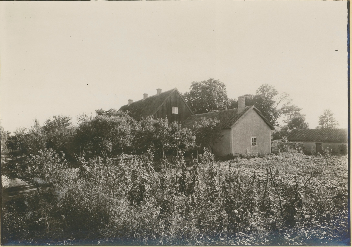 Till vänster huvudbyggningens högra spetsiga sadeltak. Kalkstenshuset i mitten tvättstuga. Till höger grishus av sten, en mycket gammal byggnad, bl.a. synlig på karta 1815. Taket är täckt med torv med flis i takfoten, under torven halm. Över hela torvtaket senare tegel.