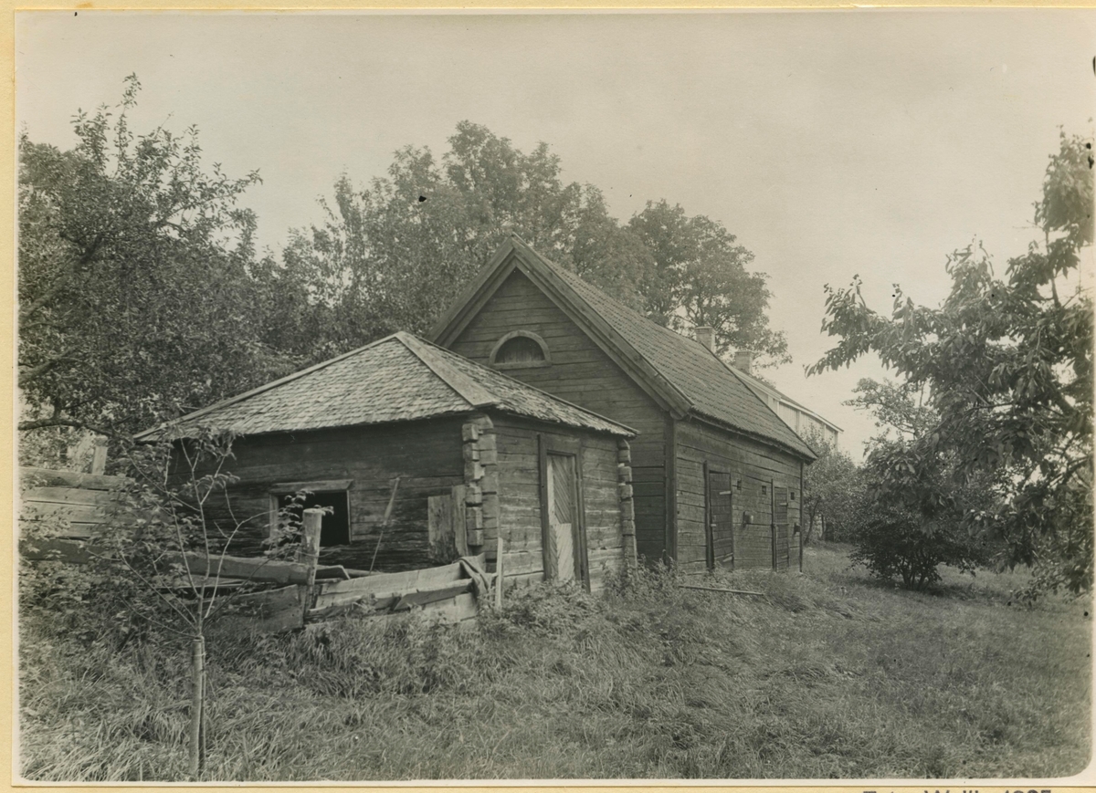 Trädgården: (planen .. 14,15) Till vänster gammal fatbur av korsknutat timmer under toppigt tak. Till höger magasin i en botten. Timmer med avsågade knutar.