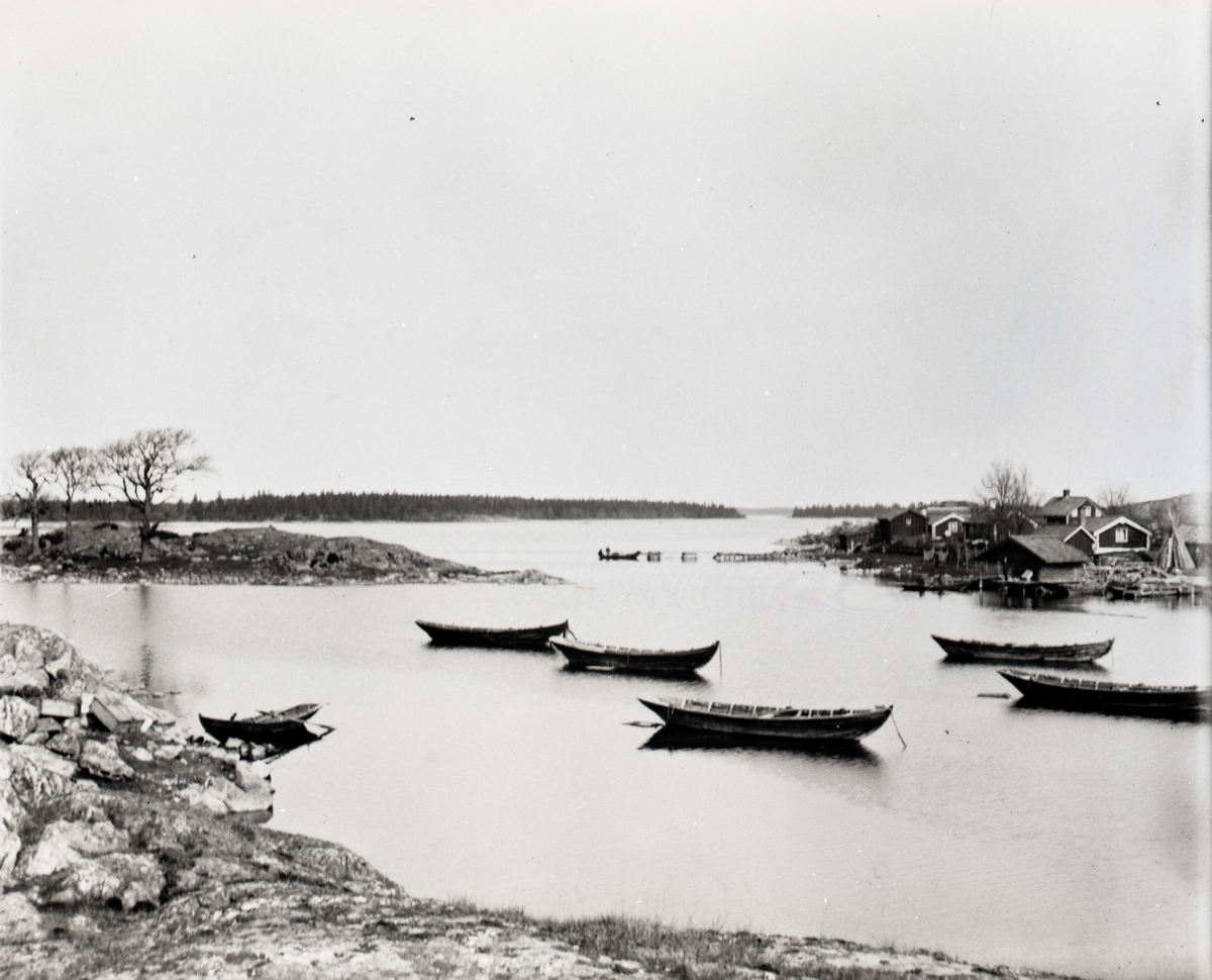 Vy över viken med båtar och stugor.