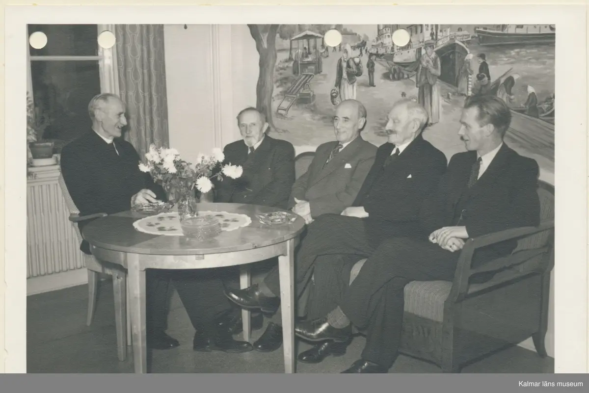 Detta kort är taget på ålderdomshemmet Falkenberg den 5/11 1949 i samband med invigningen av nytt dagrum samt ny pensionärsmatsal. Personerna är från vänster: Nestorn bland styrelsens ledamöter, bankdirektör Alb. Lindeström, förutvarande ordförande, skeppshandlaren Gustaf Petersson, sekreteraren Emil Wirell, godsägare Gottfrid Johnsson, nuvarande ordförande exek.-bitr. (exekutivbiträde?) Hans Oscarsson.