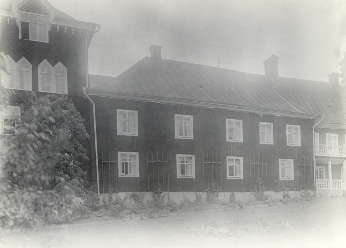 Motiv från Tyllinge säteri, huvudbyggnaden sedd från trädgården. Till vänster det av Hammarsbjöld ritade tornet.