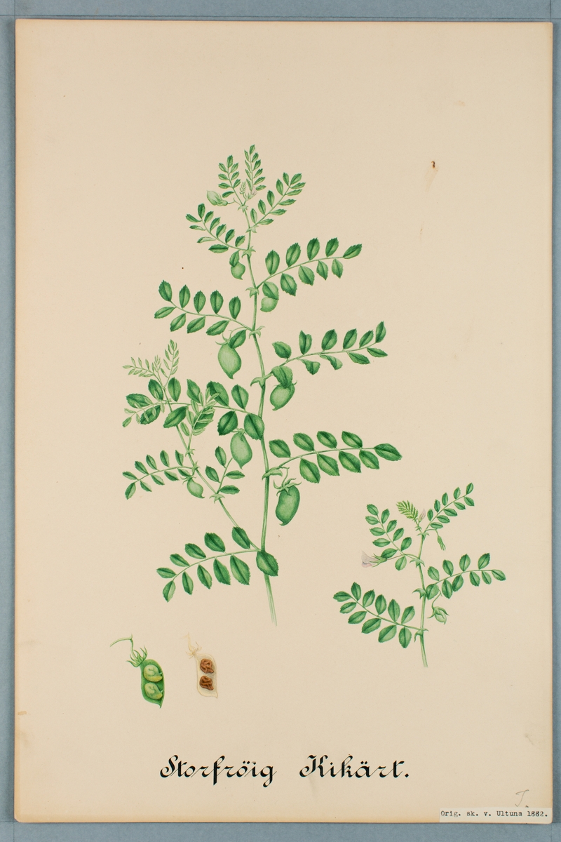 Sveriges kulturväxter. Illustration utförd av Henriette Sjöberg. Kikärter, storfröiga. Odlade Ultuna 1882. Inv. nr. C101 : 227.