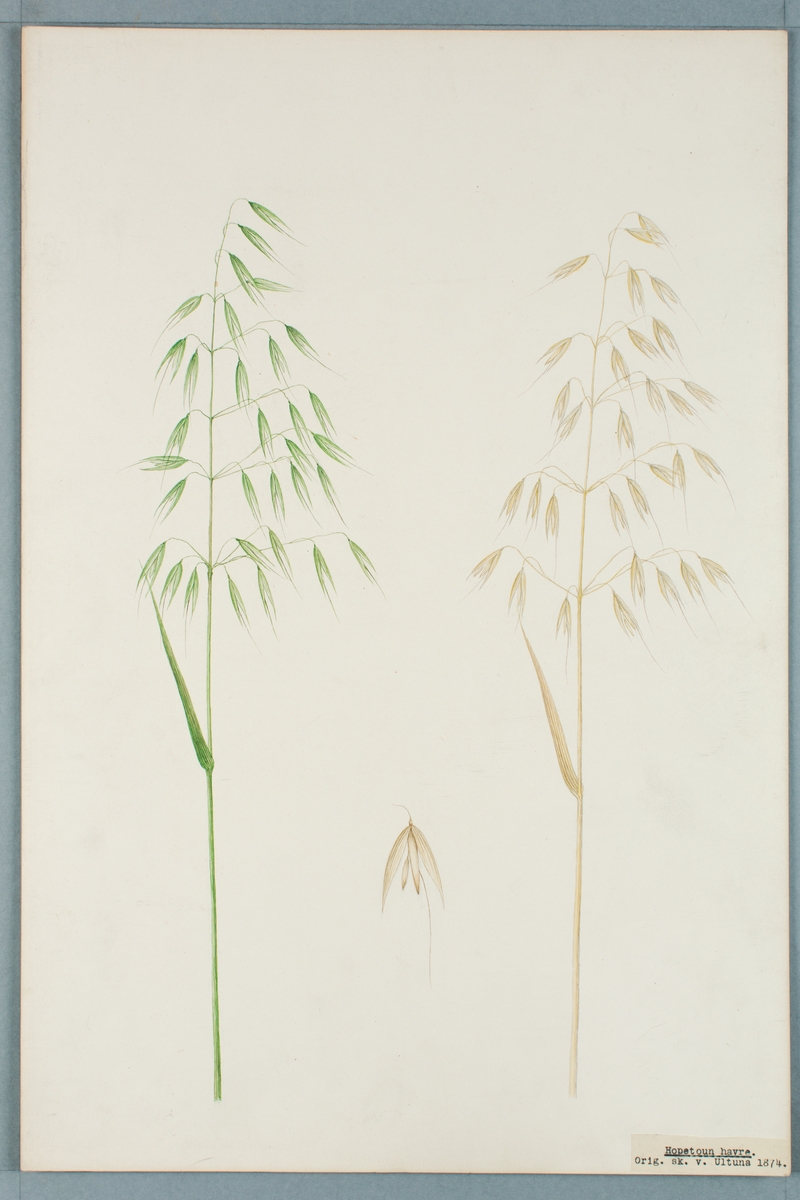 Sveriges kulturväxter. Illustration utförd av Henriette Sjöberg. Havre, Hopetoun. Odlad Ultuna 1874. Inv. nr. C101 : 196.
