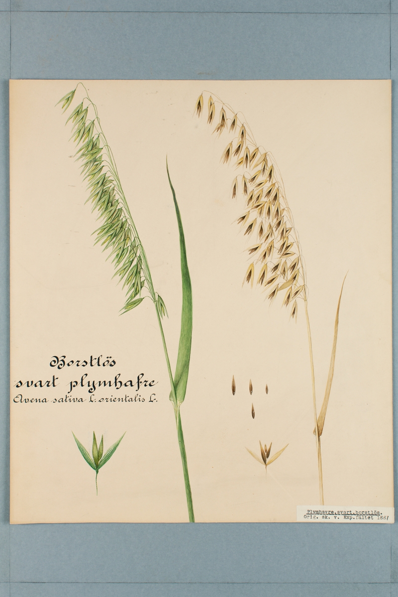 Sveriges kulturväxter. Illustration utförd av Henriette Sjöberg. Plymhavre, svart, borstlös. Odlad Experimentalfältet 1887. Inv. nr. C101 : 199.