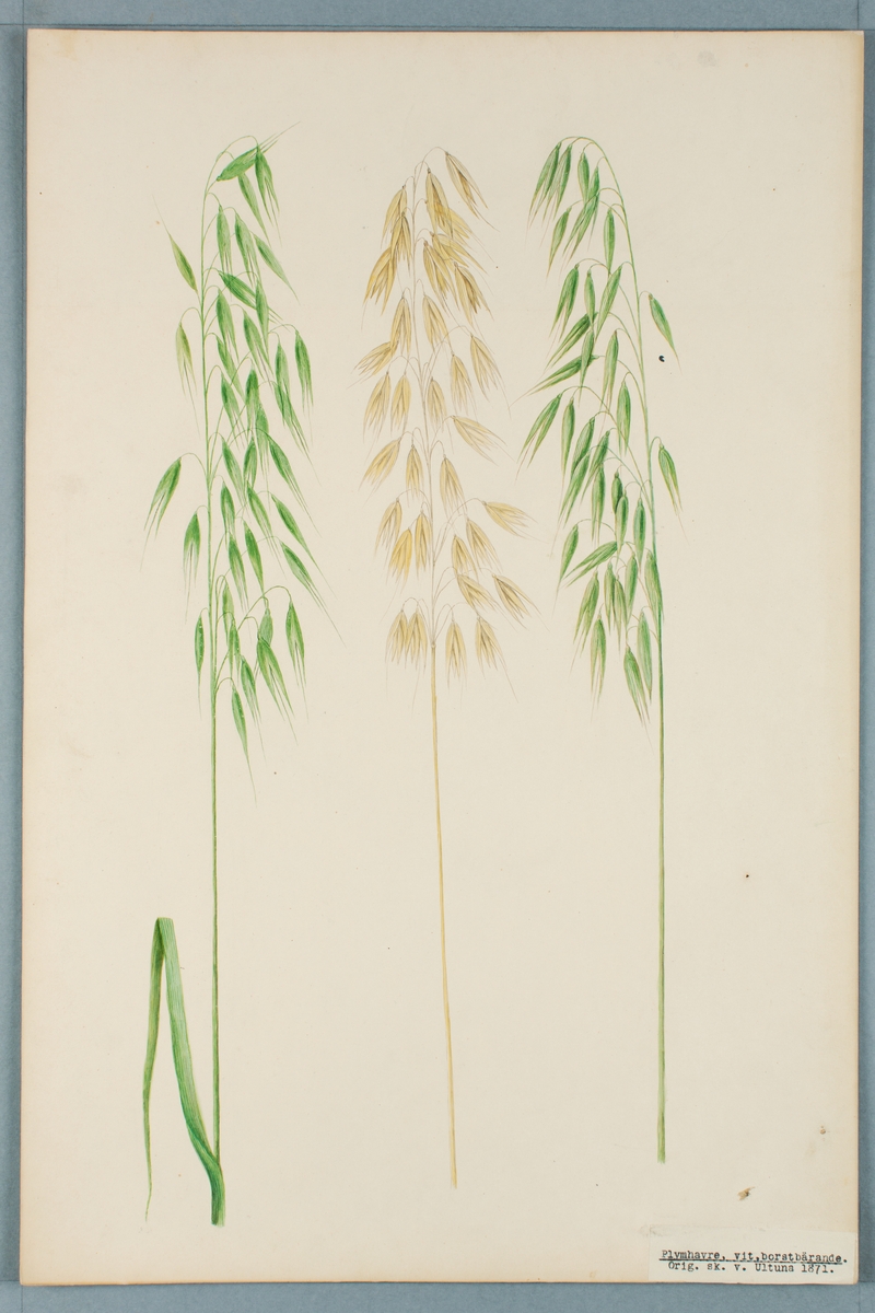 Sveriges kulturväxter. Illustration utförd av Henriette Sjöberg. Plymhavre, vit, borstbärande. Odlad Ultuna 1871. Inv. nr. C101 : 200a. Jämför NMA.0098322.