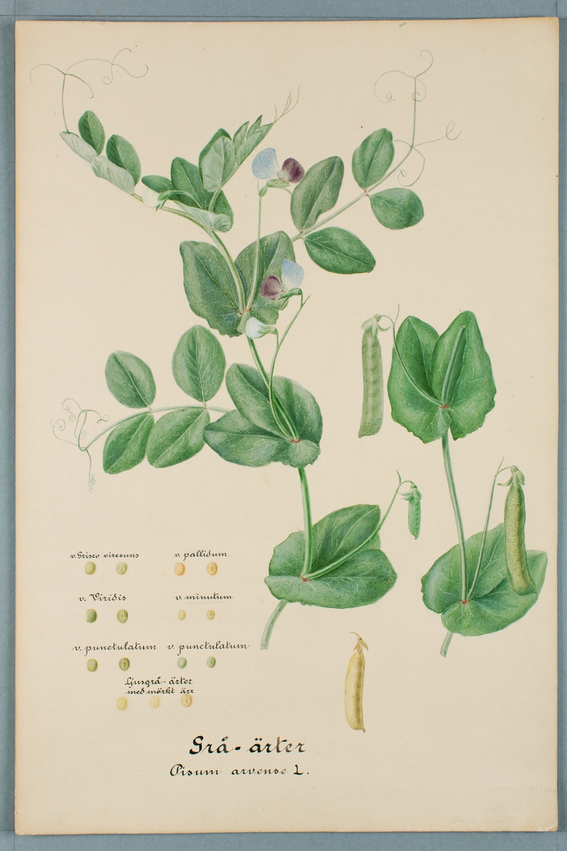 Sveriges kulturväxter. Illustration utförd av Henriette Sjöberg. Ärter, Gråärter. Odlade Ultuna, datering saknas.