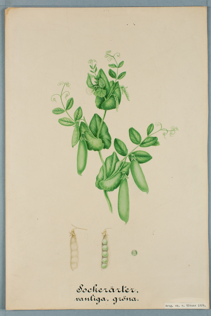 Sveriges kulturväxter. Illustration utförd av Henriette Sjöberg. Sockerärter, vanliga, gröna. Odlade Ultuna 1875. Inv. nr. C101 : 423.
