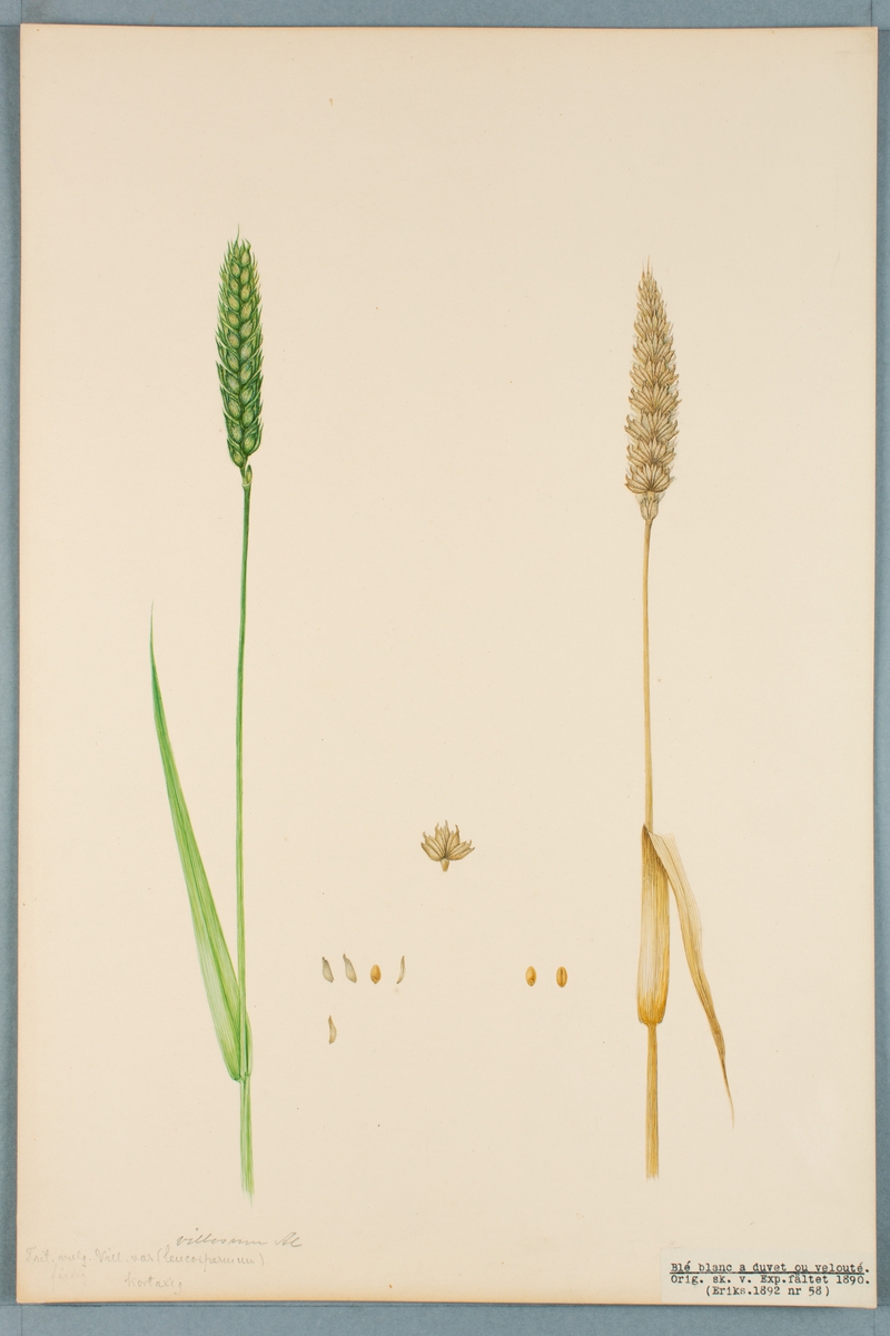 Sveriges kulturväxter. Illustration utförd av Henriette Sjöberg. Vete, Blé blanc à duvet ou velouté. Odlat Experimentalfältet 1890. Eriksson 1892, nr. 58. Inv. nr. C101 : 8. Signerad "H.S. Exper 1890.".