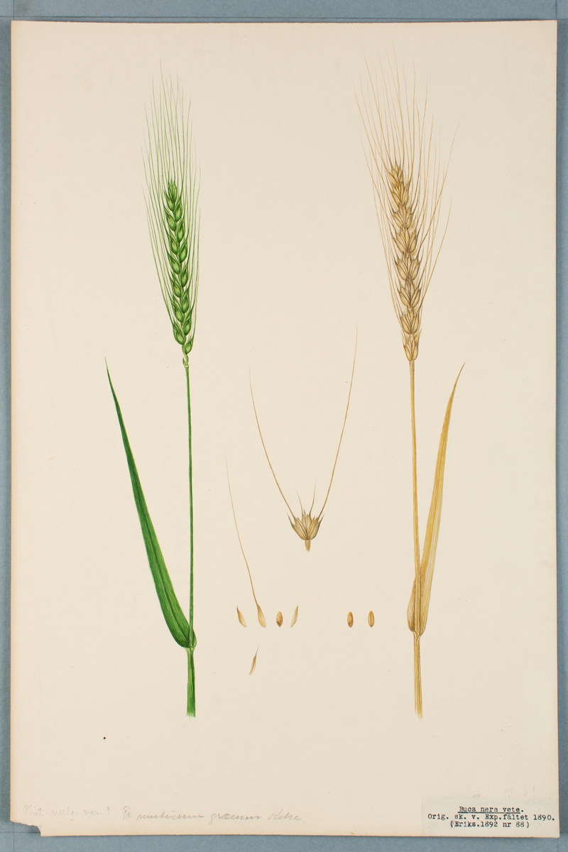 Sveriges kulturväxter. Illustration utförd av Henriette Sjöberg. Vete, Buca nera. Odlat Experimentalfältet 1890. Eriksson 1892, nr. 88. Inv. nr. C101 : 28. Signerad "H.S. Exper. 1890.".