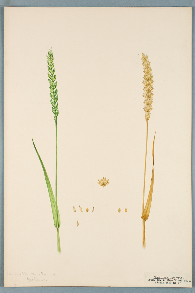 Sveriges kulturväxter. Illustration utförd av Henriette Sjöberg. Vete, Champion White. Odlat Experimentalfältet 1890. Eriksson 1892, nr. 27. Inv. nr. C101 : 32. Signerad "H.S. Exper 1890.".