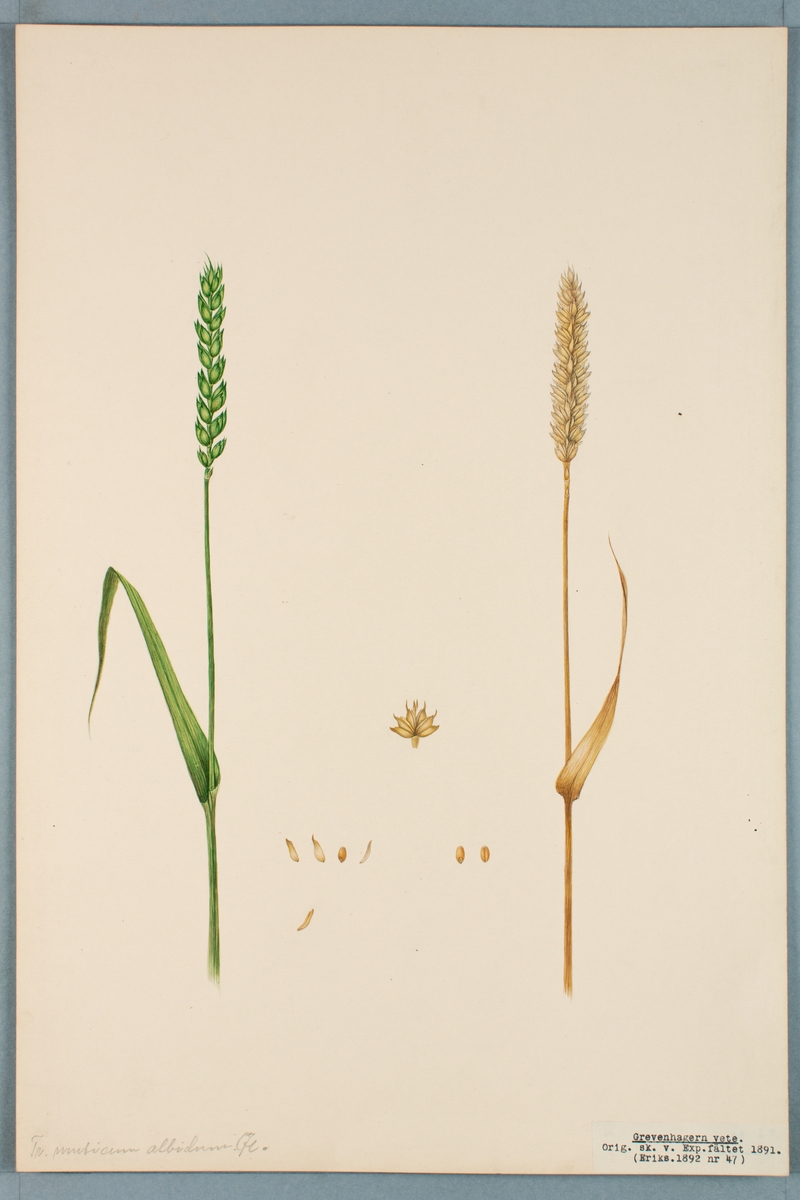 Sveriges kulturväxter. Illustration utförd av Henriette Sjöberg. Vete, Grevenhagern. Odlat Experimentalfältet 1891. Eriksson 1892, nr. 47. Inv. nr. C101 : 48. Signerad "H.S. 1891 Exper.".