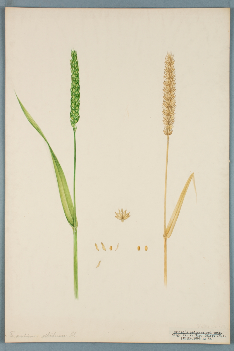 Sveriges kulturväxter. Illustration utförd av Henriette Sjöberg. Vete, Hallet's pedigree red. Odlat Experimentalfältet 1891. Eriksson 1892, nr. 34. Inv. nr. C101 : 53. Signerad "H.S. Exper 1891.".