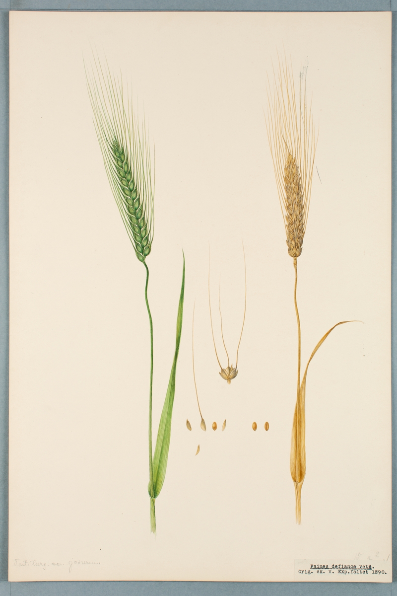Sveriges kulturväxter. Illustration utförd av Henriette Sjöberg. Vete, Paines defiance. Odlat Experimentalfältet 1890. Inv. nr. C101 : 74. Signerad "H.S. Exper 1890.".