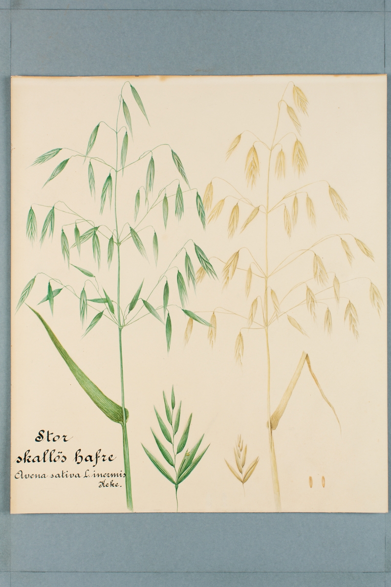 Sveriges kulturväxter. Illustration utförd av Henriette Sjöberg. Havre, skallös, storkornig. Odlingsplats och datering saknas.