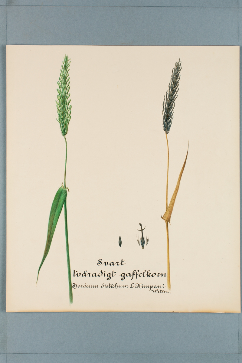 Sveriges kulturväxter. Illustration utförd av Henriette Sjöberg. Korn, Gaffelkorn, skallöst, svart, tvåradigt. Odingsplats och datering saknas.