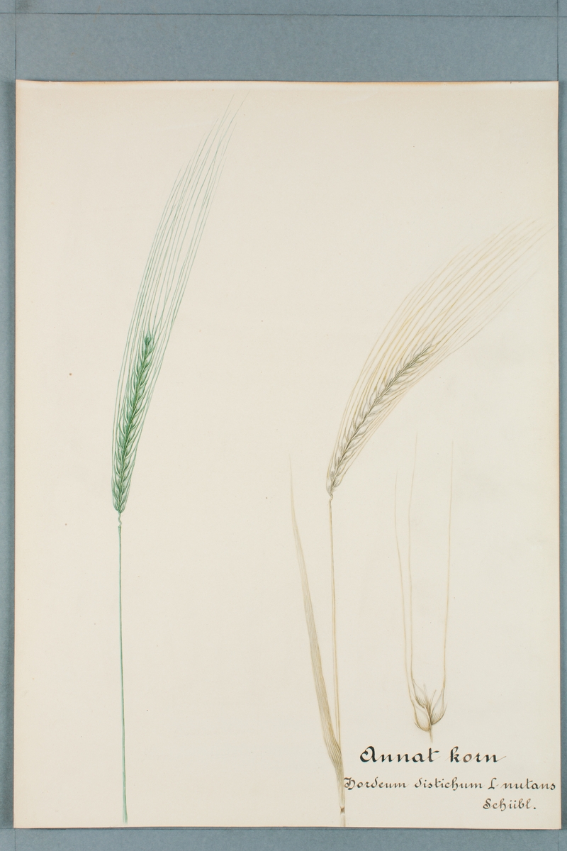 Sveriges kulturväxter. Illustration utförd av Henriette Sjöberg. Korn, annat korn. Skotskt (uppgift om detta saknas dock på arket). Odlingsplats och datering saknas.