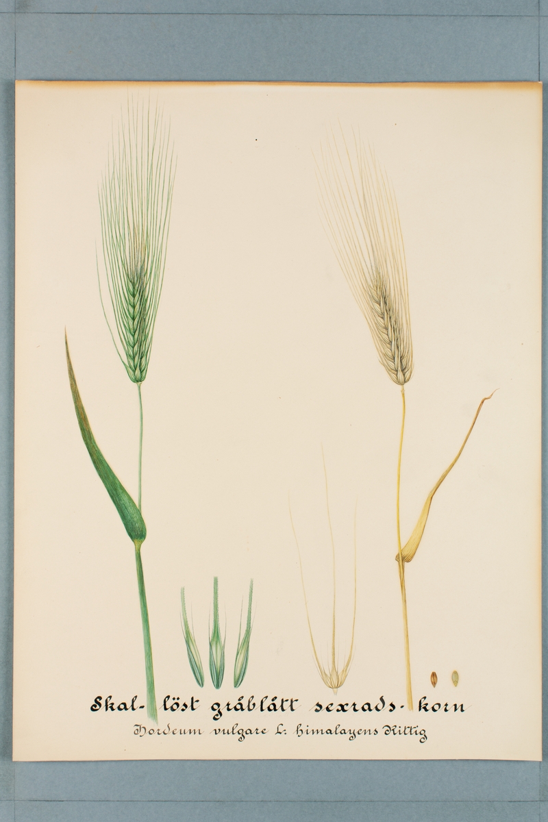 Sveriges kulturväxter. Illustration utförd av Henriette Sjöberg. Korn, sexradigt, skallöst, gråblått. Odlingsplats och datering saknas.