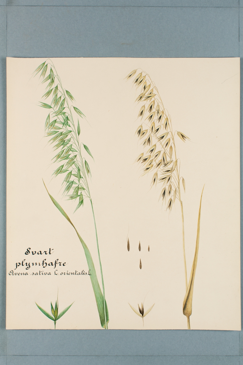 Sveriges kulturväxter. Illustration utförd av Henriette Sjöberg. Havre, Plymhavre, svart. Odlingsplats och datering saknas.