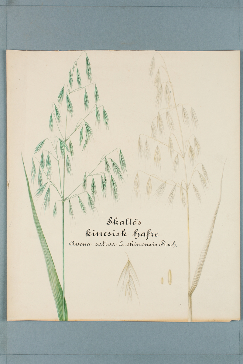 Sveriges kulturväxter. Illustration utförd av Henriette Sjöberg. Havre, Kinesisk, skallös. Odlingsplats och datering saknas.