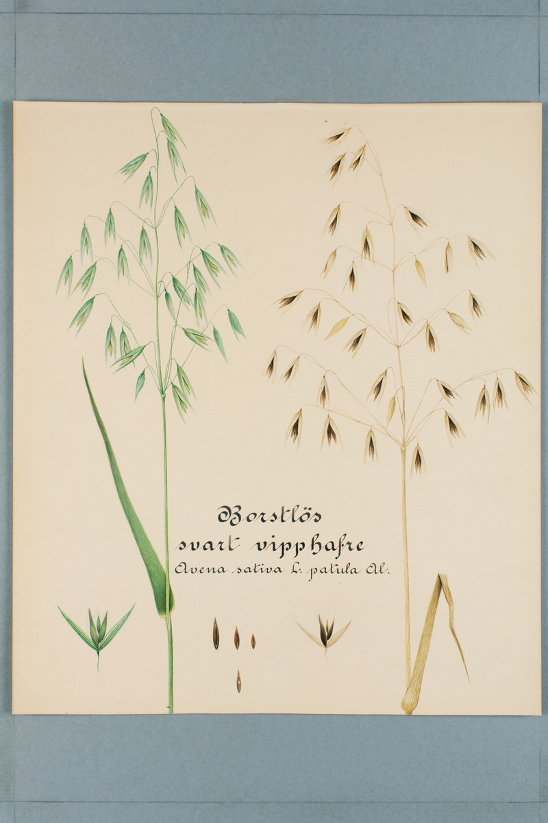 Sveriges kulturväxter. Illustration utförd av Henriette Sjöberg. Havre, Vipphavre, borstlös, svart. Odlingsplats och datering saknas.