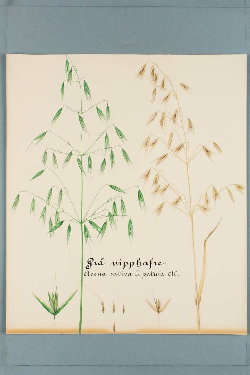 Sveriges kulturväxter. Illustration utförd av Henriette Sjöberg. Havre, Vipphavre, grå. Odlingsplats och datering saknas.