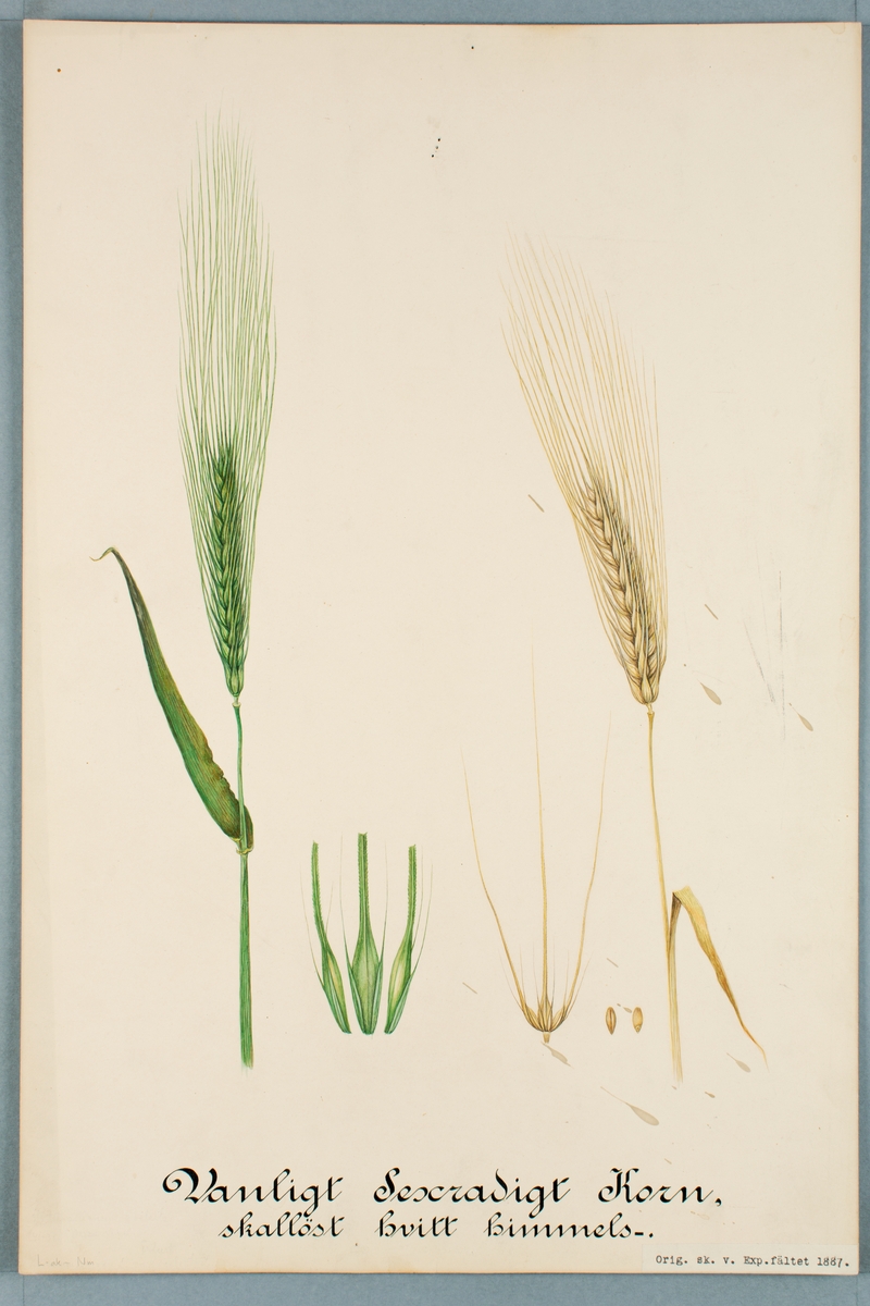 Sveriges kulturväxter. Illustration utförd av Henriette Sjöberg. Korn, Himmelskorn, vitt, skallöst. Odlat Experimentalfältet 1887. Signerad "Henriette S.g 1887. Exper fälte.".