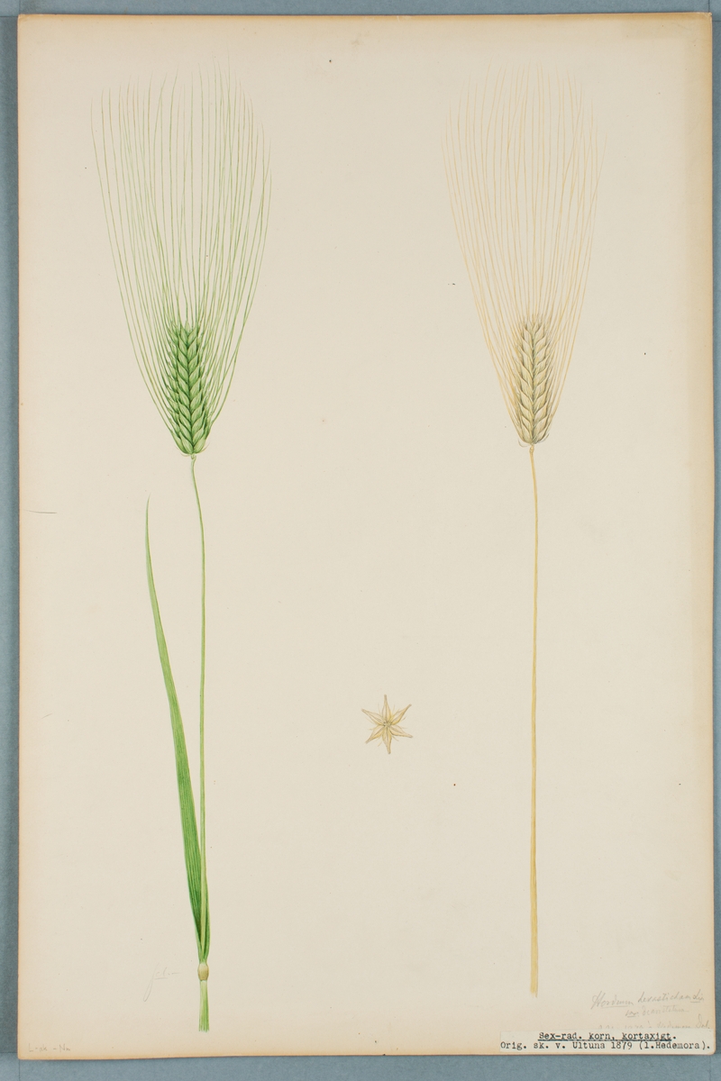 Sveriges kulturväxter. Illustration utförd av Henriette Sjöberg. Korn, sexradigt, kortaxigt. Odlat Ultuna eller Hedemora 1879. Jämför NMA.0098586.