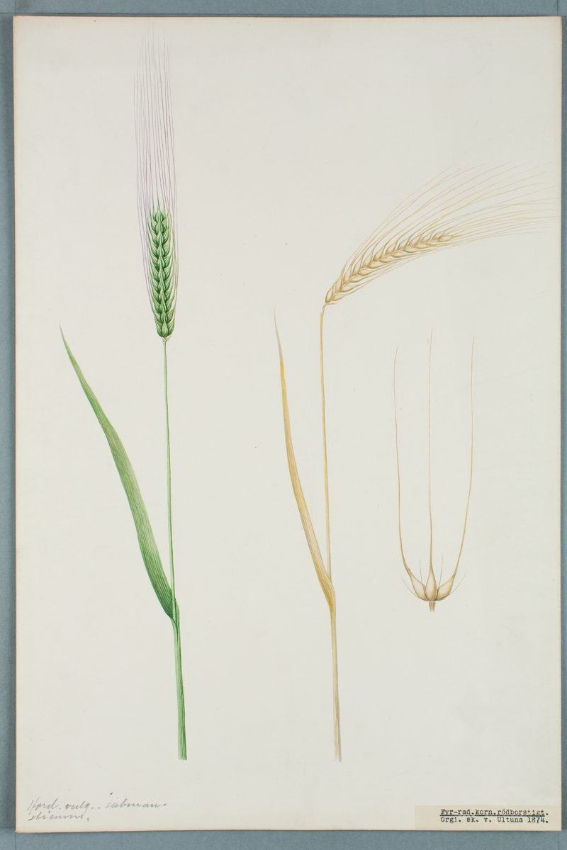 Sveriges kulturväxter. Illustration utförd av Henriette Sjöberg. Korn, fyrradigt, rödborstigt. Odlat Ultuna 1874.