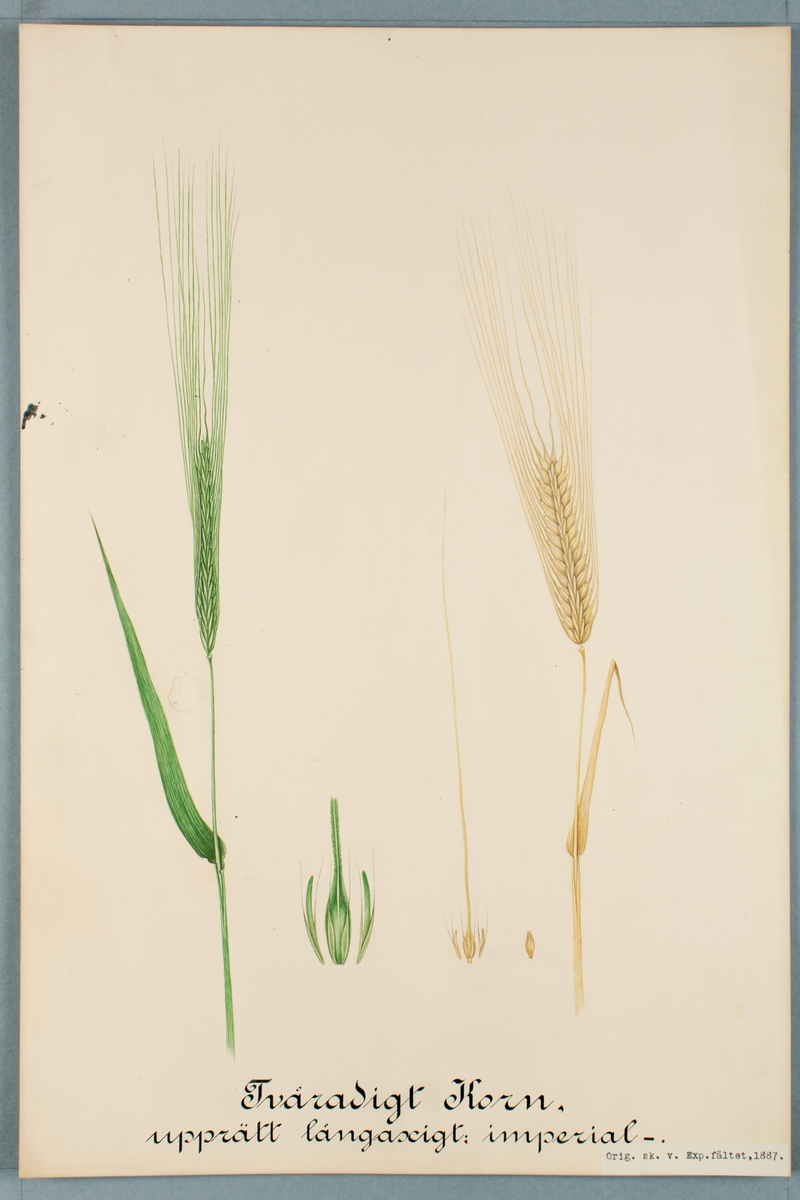Sveriges kulturväxter. Illustration utförd av Henriette Sjöberg. Korn, tvåradigt, upprätt, långaxigt, Imperialkorn. Odlat Experminetalfältet 1887. Signerad "Henriette S.g 1887 Exper fälte.". Jämför NMA.0098595.