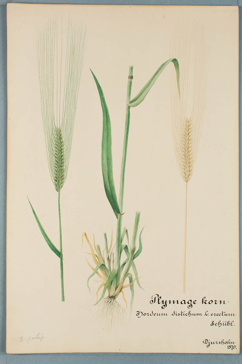 Sveriges kulturväxter. Illustration utförd av Henriette Sjöberg. Korn, tvåradigt, Plymage. Odlat Djursholm 1870.