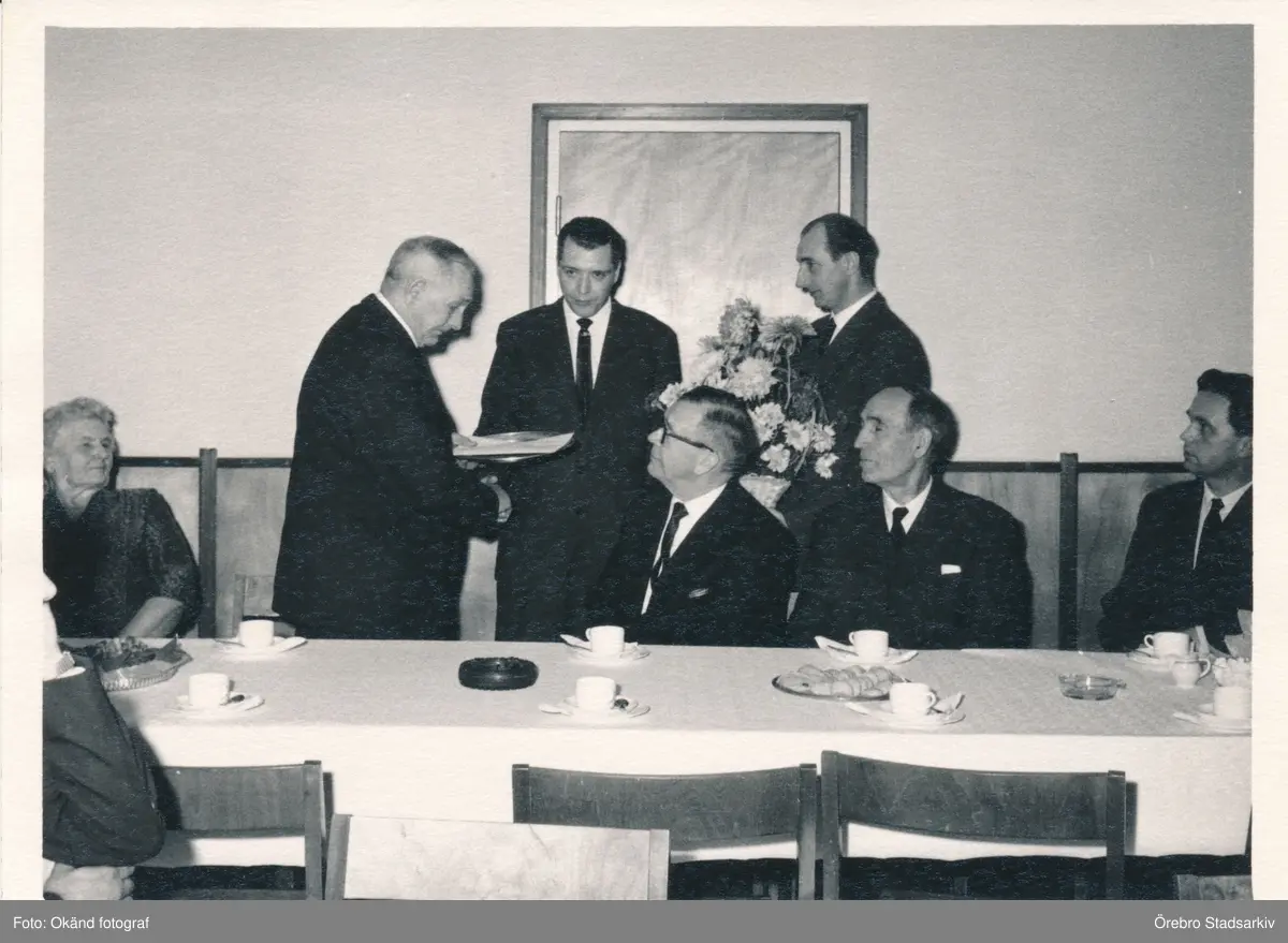 Avtackning med gåva och blommor på Örebro Trafik AB, 1960-tal