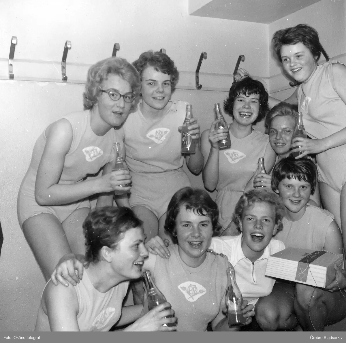 Segeryra för Örebro Praktiska Realskolas handbollslag i omklädningsrummet, Örebro, 1960