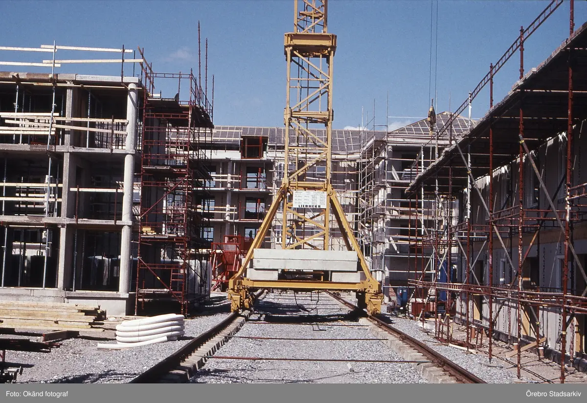 Lyftkran lyfter byggställningar i Ladugårdsängen, 1991