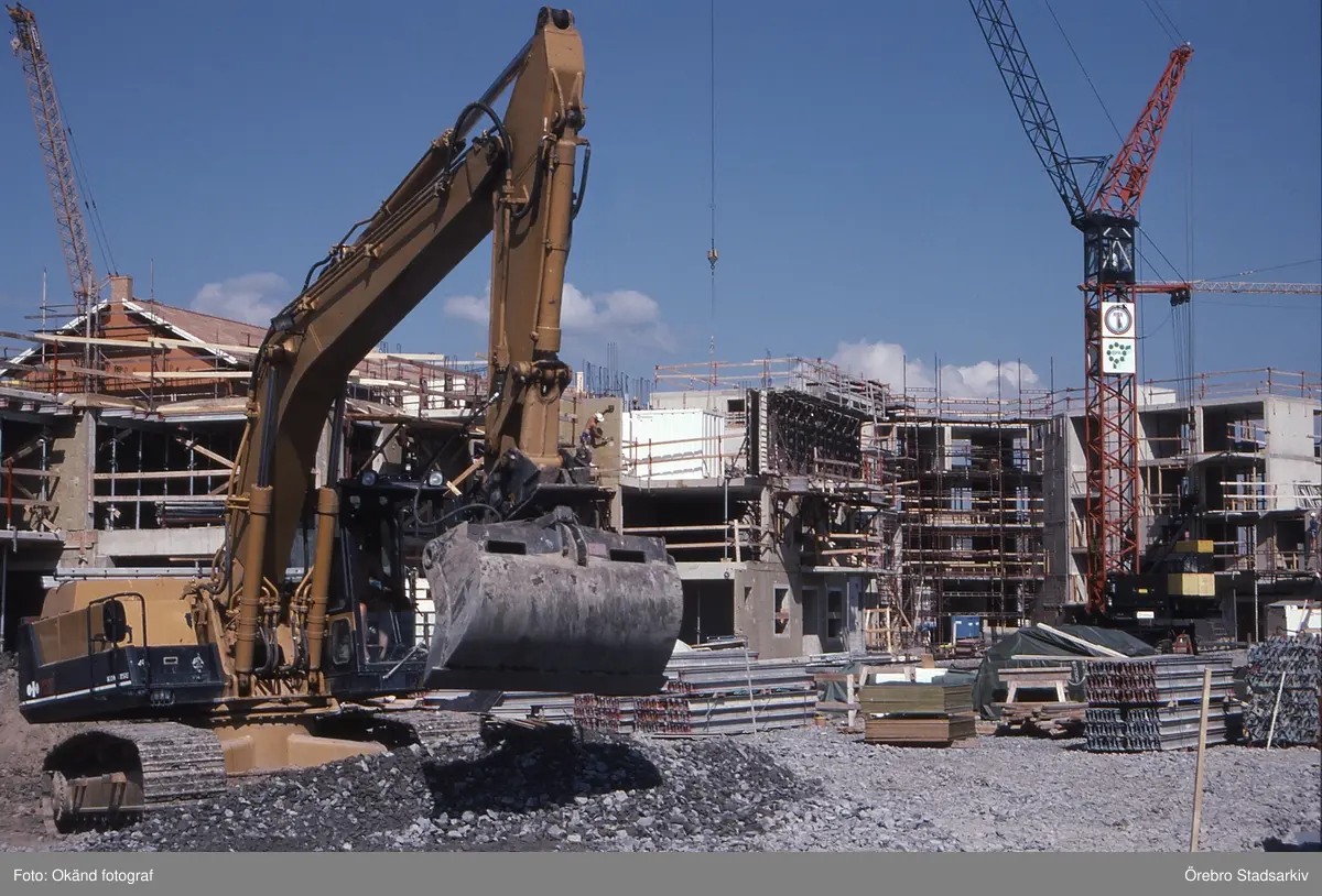 Grävmaskin i arbete i Ladugårdsängen, 1991