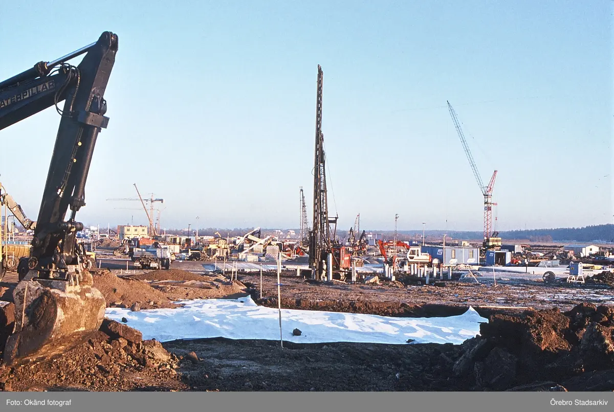 Grävskopor och lyftkranar på plats i Ladugårdsängen, februari 1991