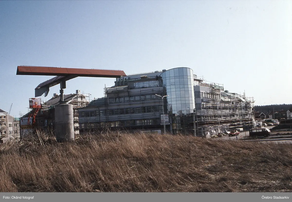 Byggnadsställningar runt huskropp i Ladugårdsängen, februari 1992