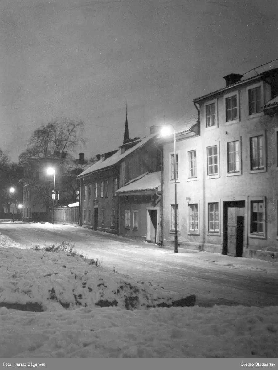 Kyrkogårdsgatan snötäckt i kvällsbelysning, 1950-tal