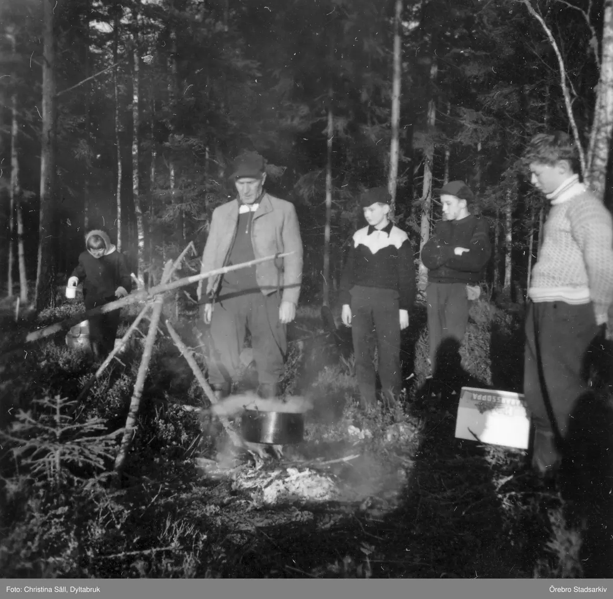Matlagning över öppen eld på Hästnäs barnkoloni, februari 1957