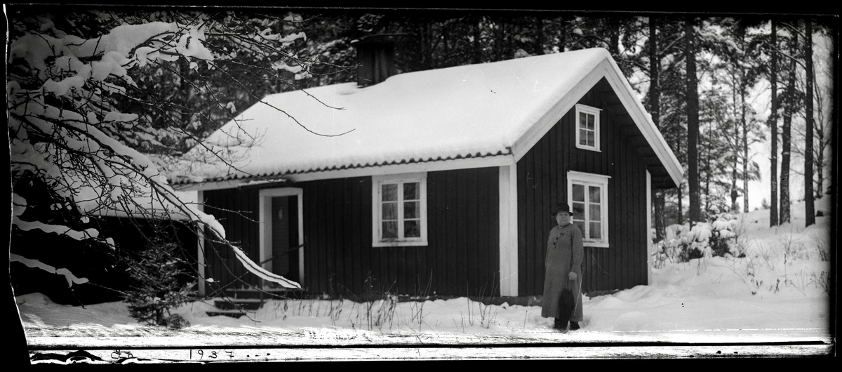 Kvinna framför litet torp