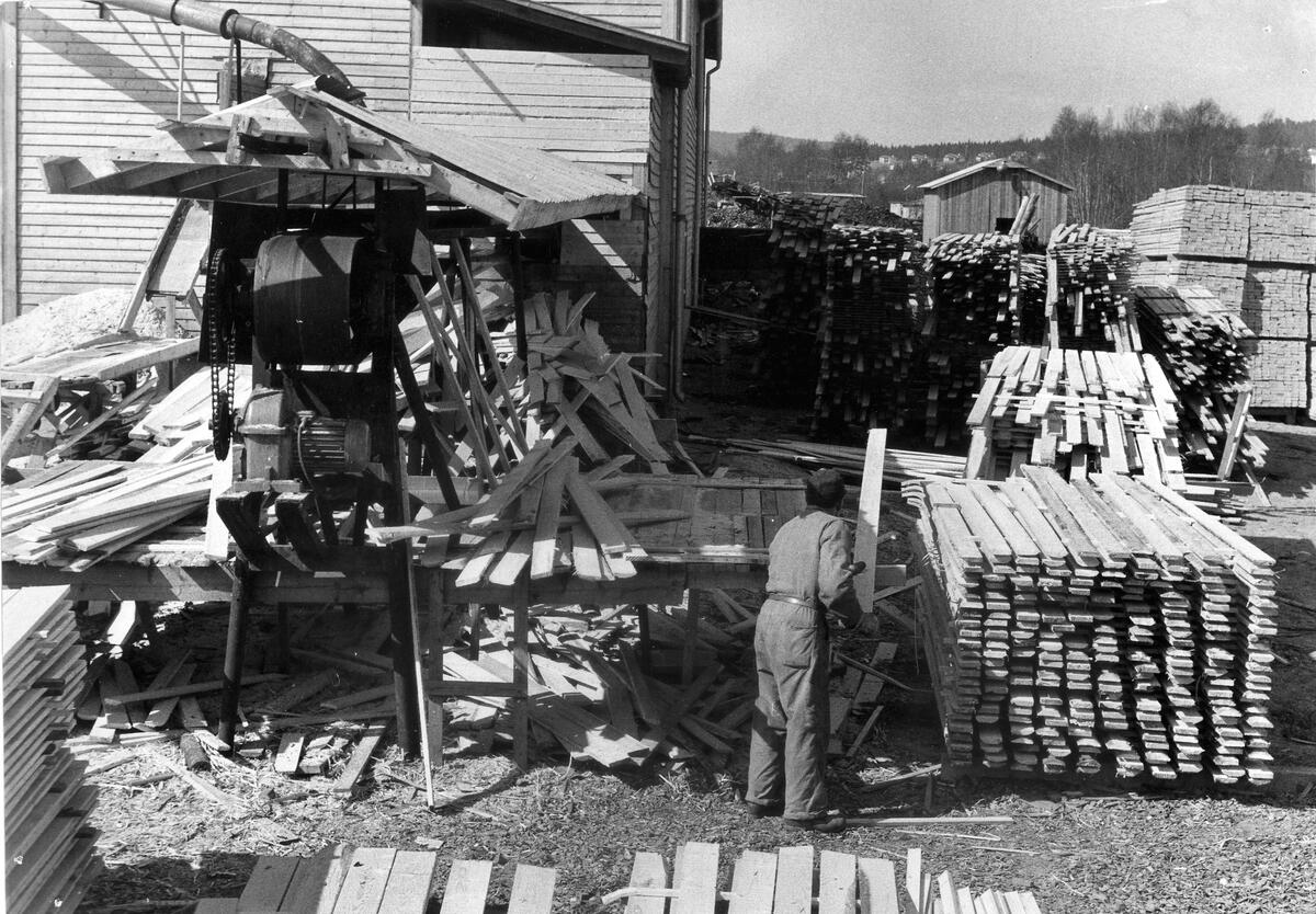 Sågverket. Andra änden på såghuset, färdiga plank staplas.