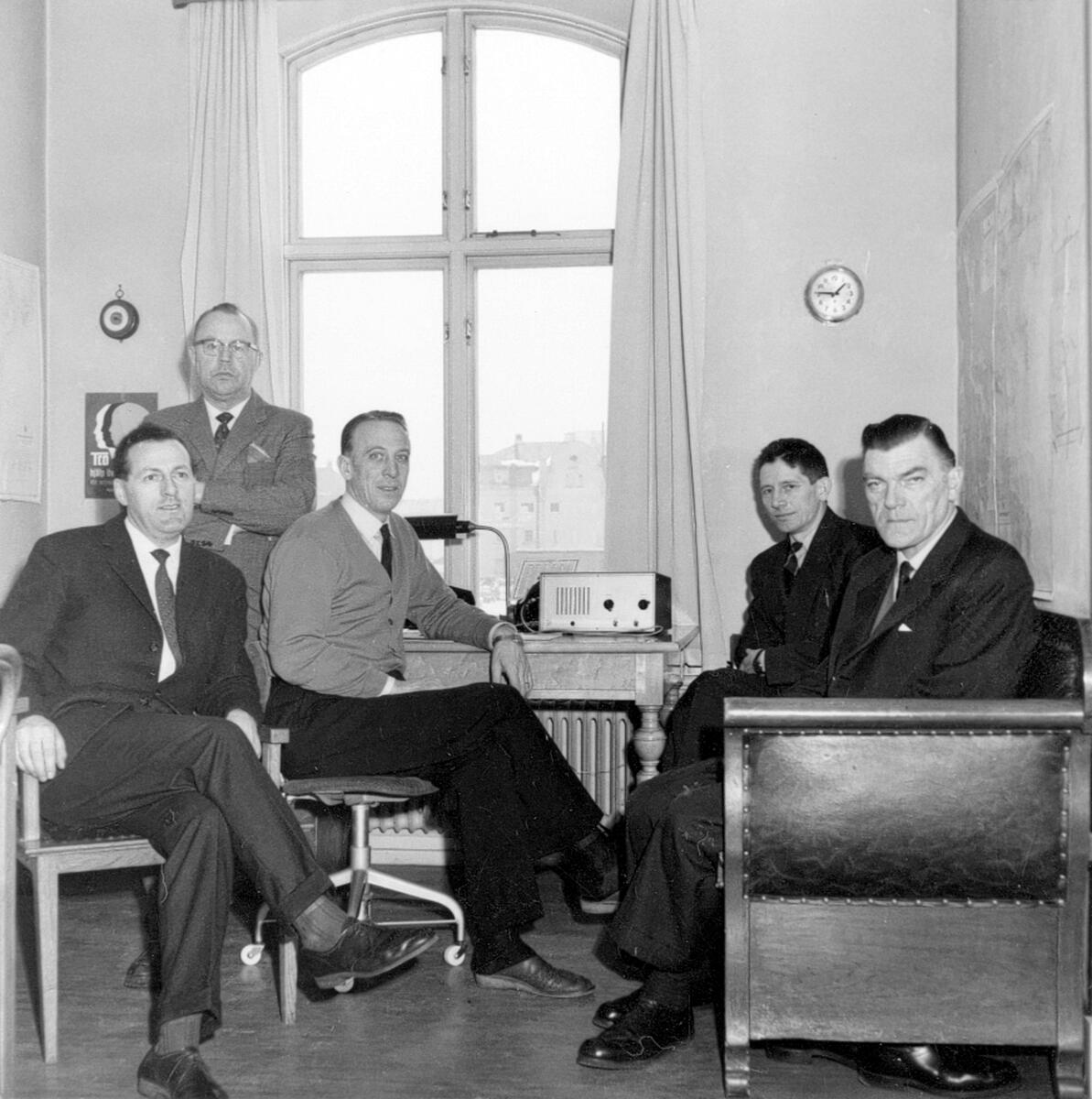 Kustbevakningens sambandscentral, första uppehållsplatsen i gamla tullkontrollörsrummet. Kustupsyningsman H.O.F. Norén, kustöversyningsman K.A. Wahlberg, förste kustuppsyningsman N.O. Gäreden, förste kustuppsyningsman K.H. Holmkvist.