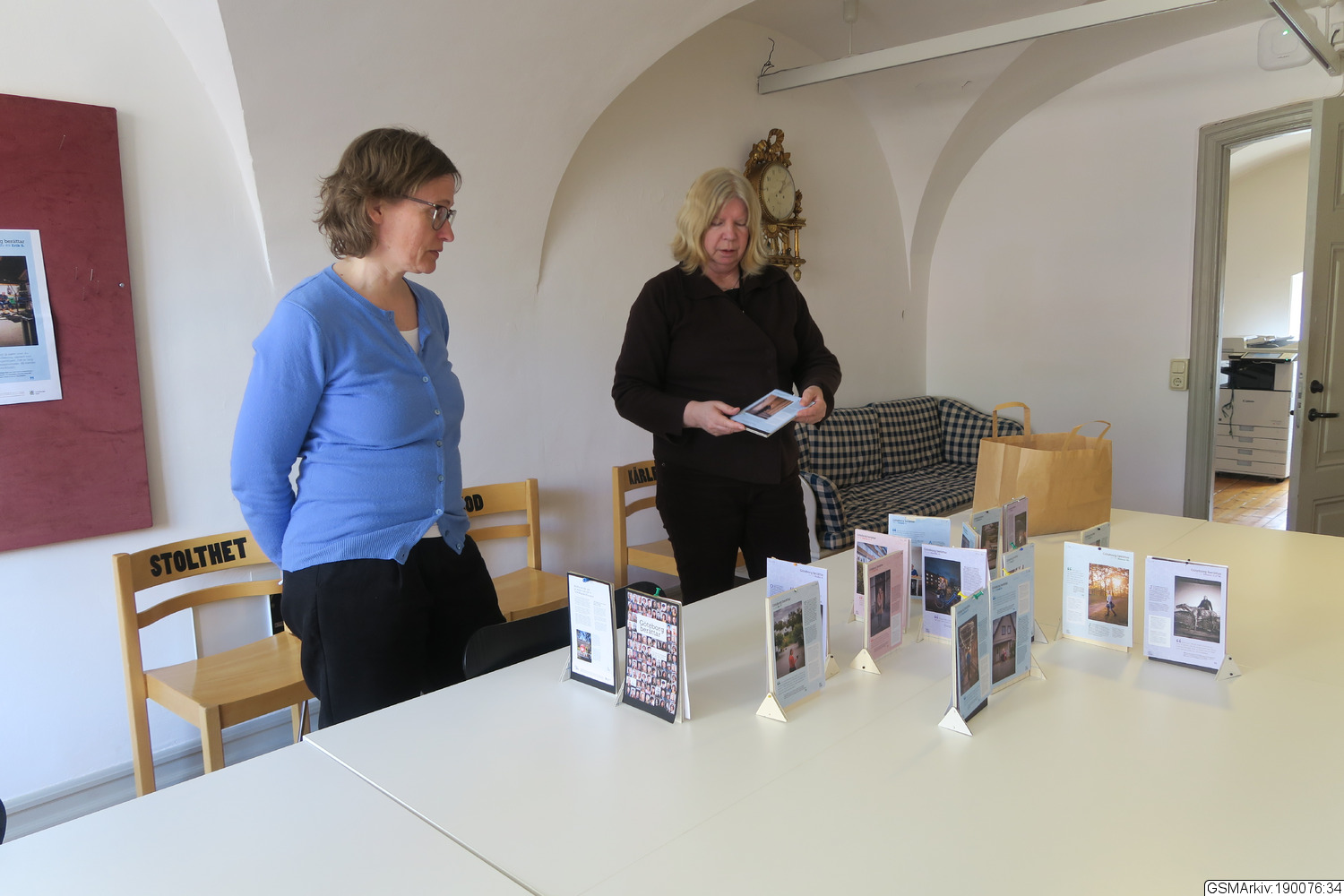Förberedelser för placering av utställningsskärmar med Marie Nyberg och Marja Ågren.