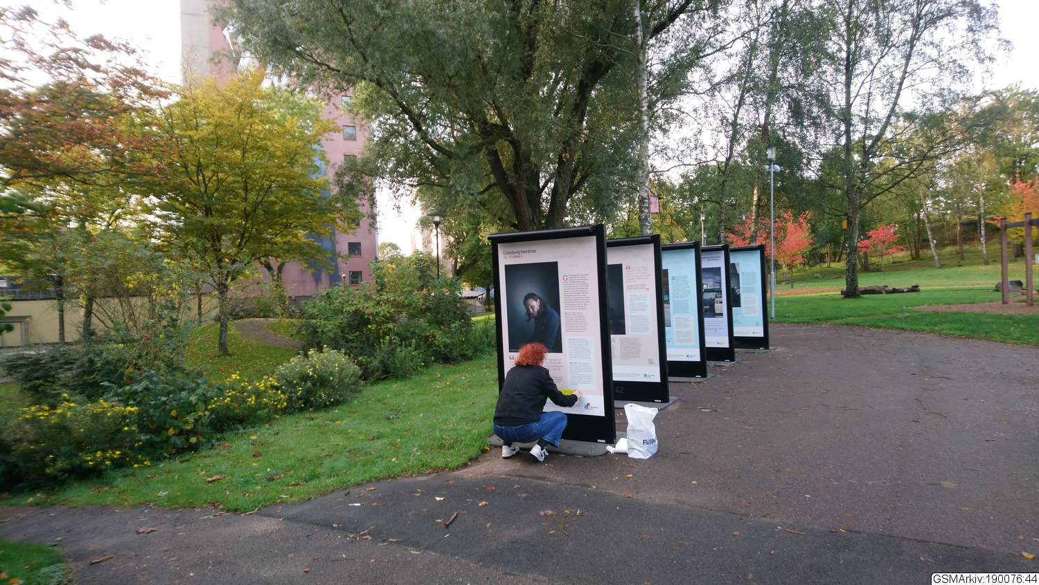 Från 15 september till 29 januari delades utställningen upp och 5 skärmar placerades ut i 10 olika stadsdelsområden. På bilden syns formgivaren Pernilla Elmtén Börjesson klistra en dekal på en av skärmarna.
